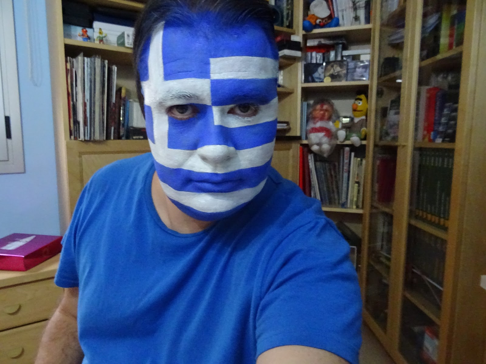 La segunda vez fue para una fiesta eurovisiva con amigos de temática griega. Para no tener que estarme demasiado rato pintándome la bandera hice la versión simplificada que los fans griegos suelen llevar en eventos deportivos futboleros y que no es más que una versión anterior de su propia bandera. Aquí podéis ver a estos fans por un lado y a mí por el otro, llevando esa bandera (por cierto, era verano también).